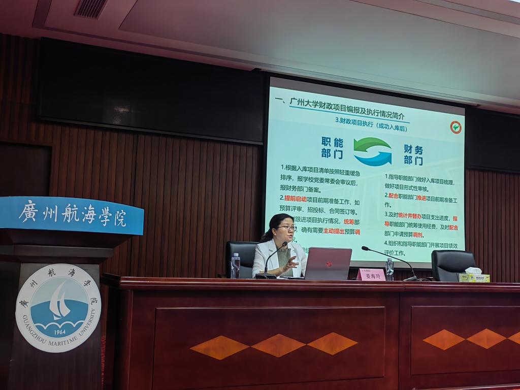 为深入贯彻党的二十大精神,学习贯彻习近平新时代中国特色社会主义思想主题教育,全面落实学校“十四五”规划,切实做好2024年市级财政资金项目储备工作,5月17日上午,财务处在行政楼A楼六楼会议室召开2024-2026年项目入库申报工作培训会。学校特邀广州大学财务处(国有资产管理办公室)副处长姜海玲作专题讲座,会议由财务处处长章祥敏主持,校内各单位负责项目库申报的主要领导及具体经办人员参会。